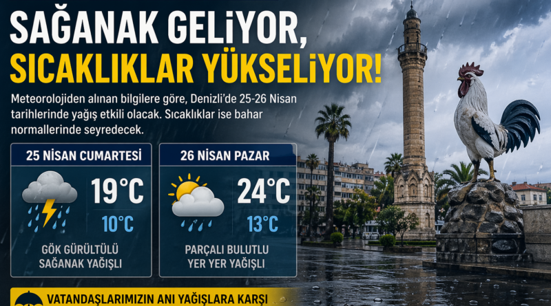 Read MoreDenizli’de 25-26 Nisan tarihlerinde yağış etkisini sürdürürken, sıcaklıklar bahar seviyelerinde seyredecek. Özellikle cumartesi günü gök gürültülü sağanak bekleniyor. Denizli’de hafta